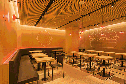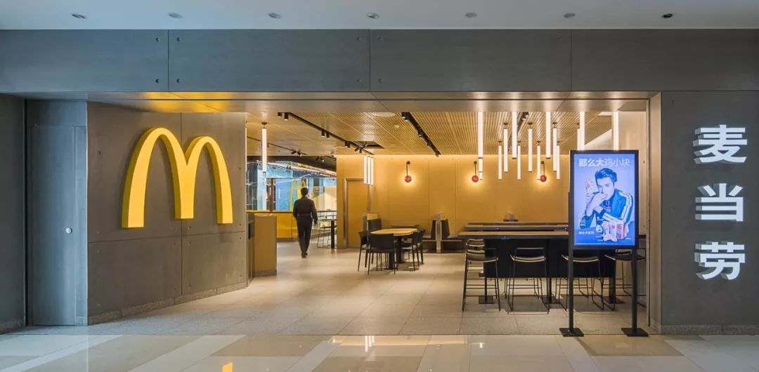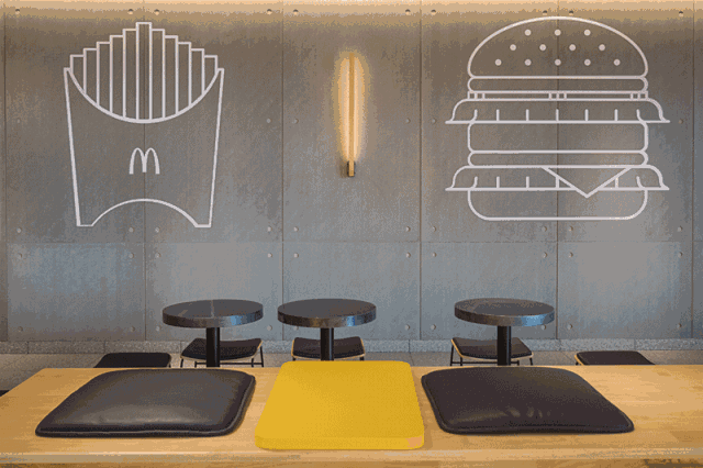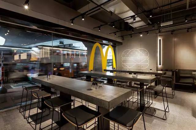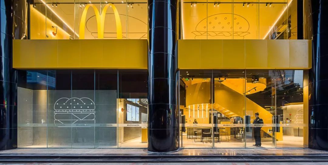 这个未来店分两层,简约、现代及工业风的设计,主色调是亮眼的M记“黄”