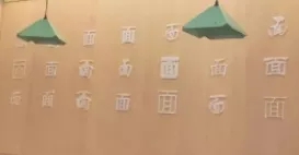 墙面上用灯箱的设计思路写着广告语“佰麸美味,面向无限可能”,并且将“面”这个字符号化,形成了不同版本的面。