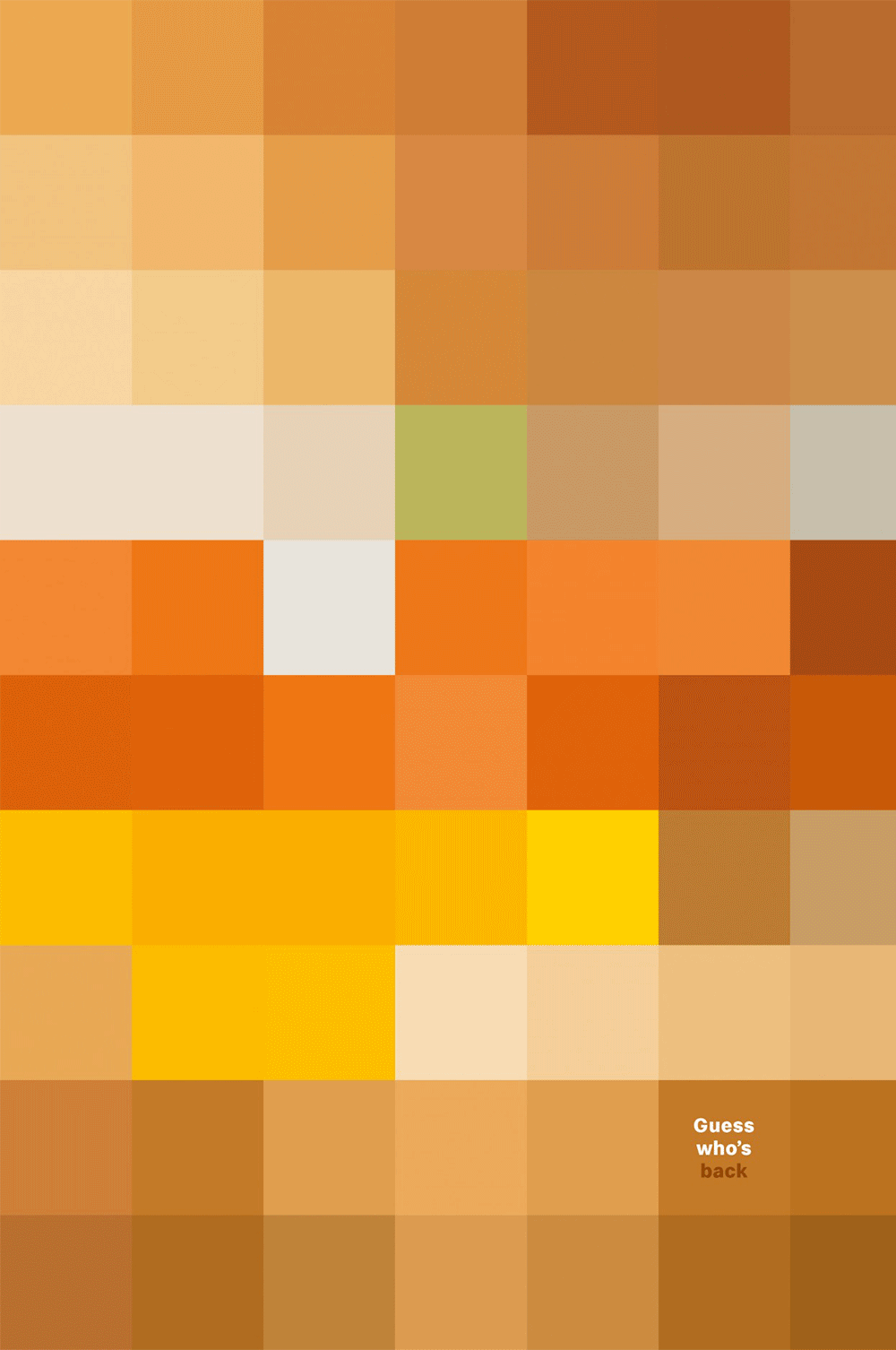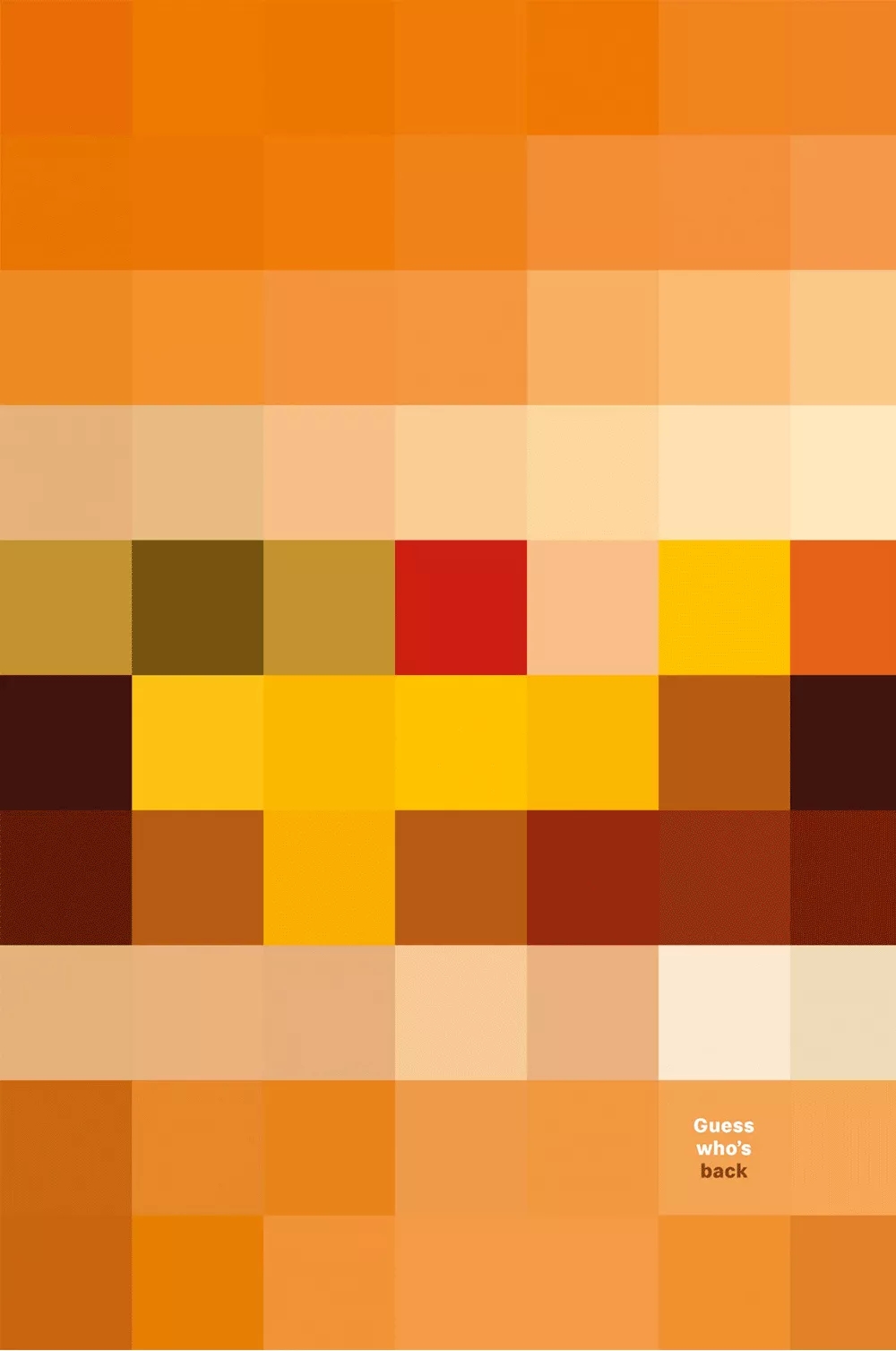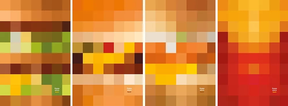 该系列广告中,没有显示任何品牌LOGO,只有一句小而短的广告语:“猜猜谁回来了”;画面则遵循极简主义,将品牌最经典最热销的产品进行像素化处理,打了一层厚厚的马赛克。但人们一看到,就很容易能认出那是麦当劳的薯条、巨无霸、吉士汉堡、麦香鱼(脱下眼镜看更明显)。
