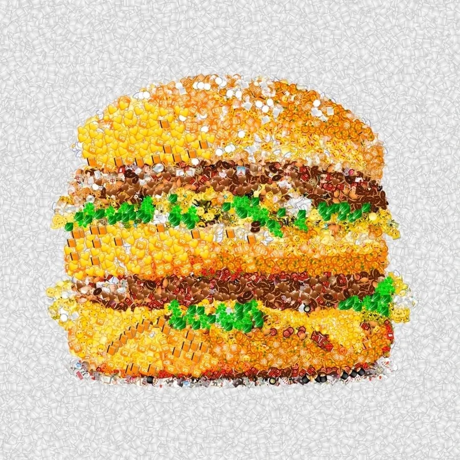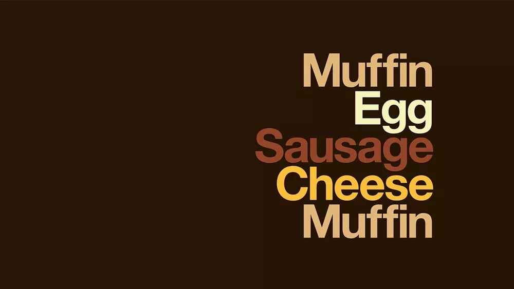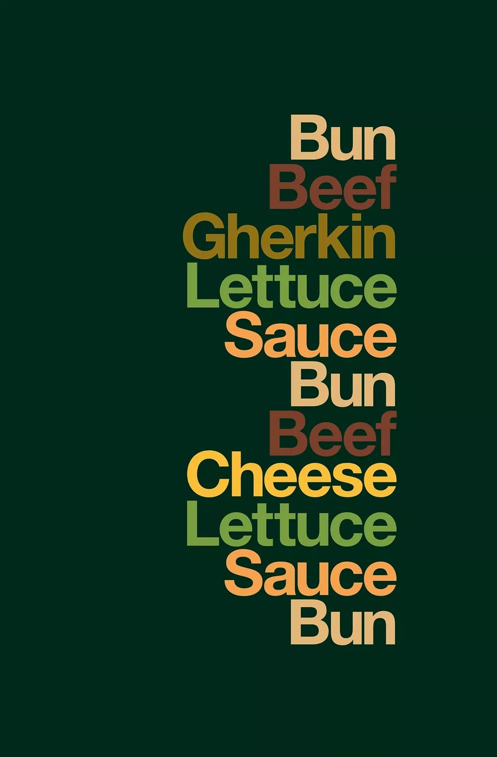 2020年2月,英国知名广告公司李奥贝纳(Leo Burnett)受麦当劳委托,设计了三张户外海报,上面没有大家熟知的LOGO,而是用食材的名称文字和对应色彩的层层组合,略带抽象地呈现出代表产品的轮廓,让人从简单有趣的排列中窥探到美味的汉堡。