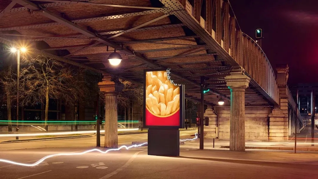 又比如2020年10月,巴黎的一组麦当劳户外灯箱广告,用“咬了几口”的特殊造型打破常规的方正形态;同样没有LOGO,却能让人一眼认出麦当劳的产品,由此引起大家的注意和社交的传播。