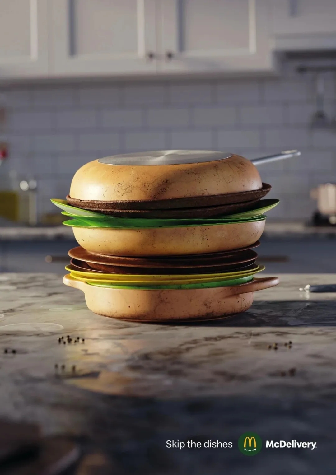 捷克麦当劳——以厨房用具拼出产品造型,看似简单,实质暗示吃麦当劳不用洗碗。