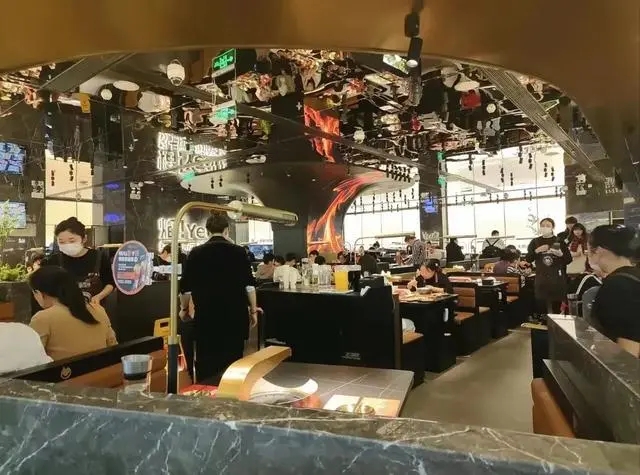 从网上分享的图片来看,海底捞子品牌焰请·烤肉铺子的餐饮空间设计风格走的是轻奢路线,餐饮空间设计以黑色为主色调,显得内敛高端。