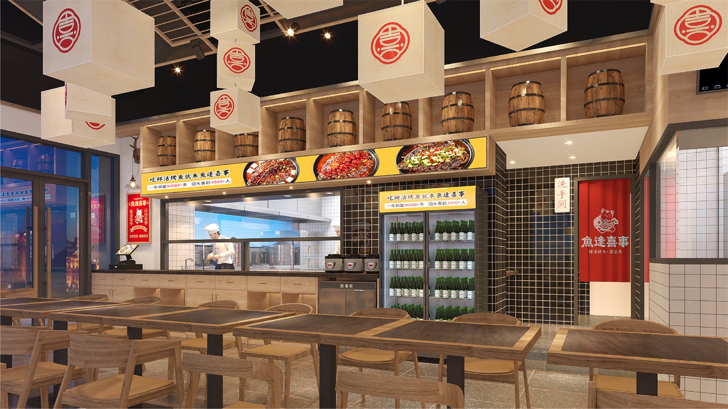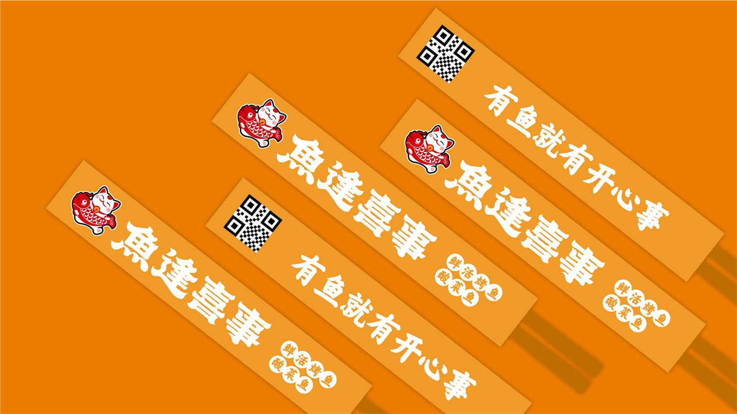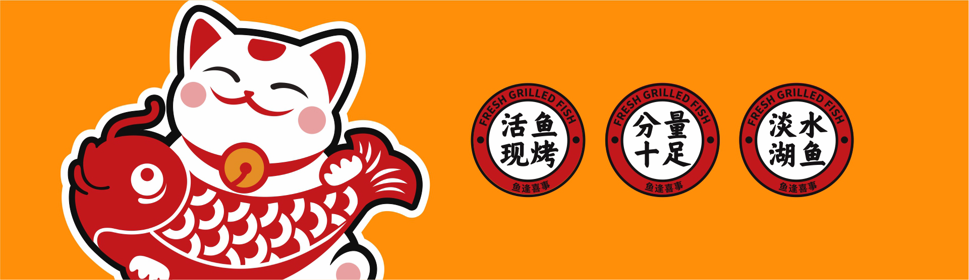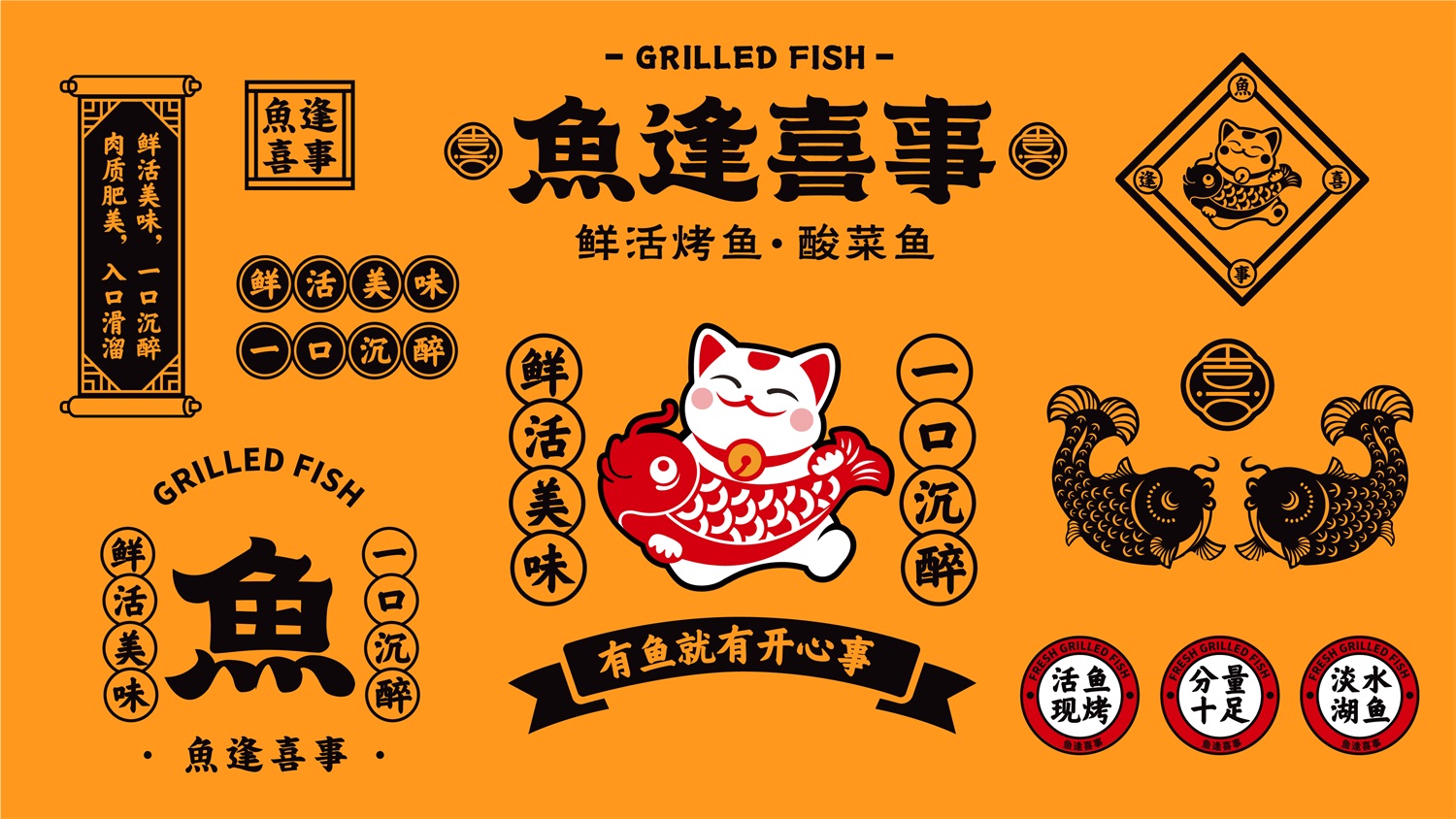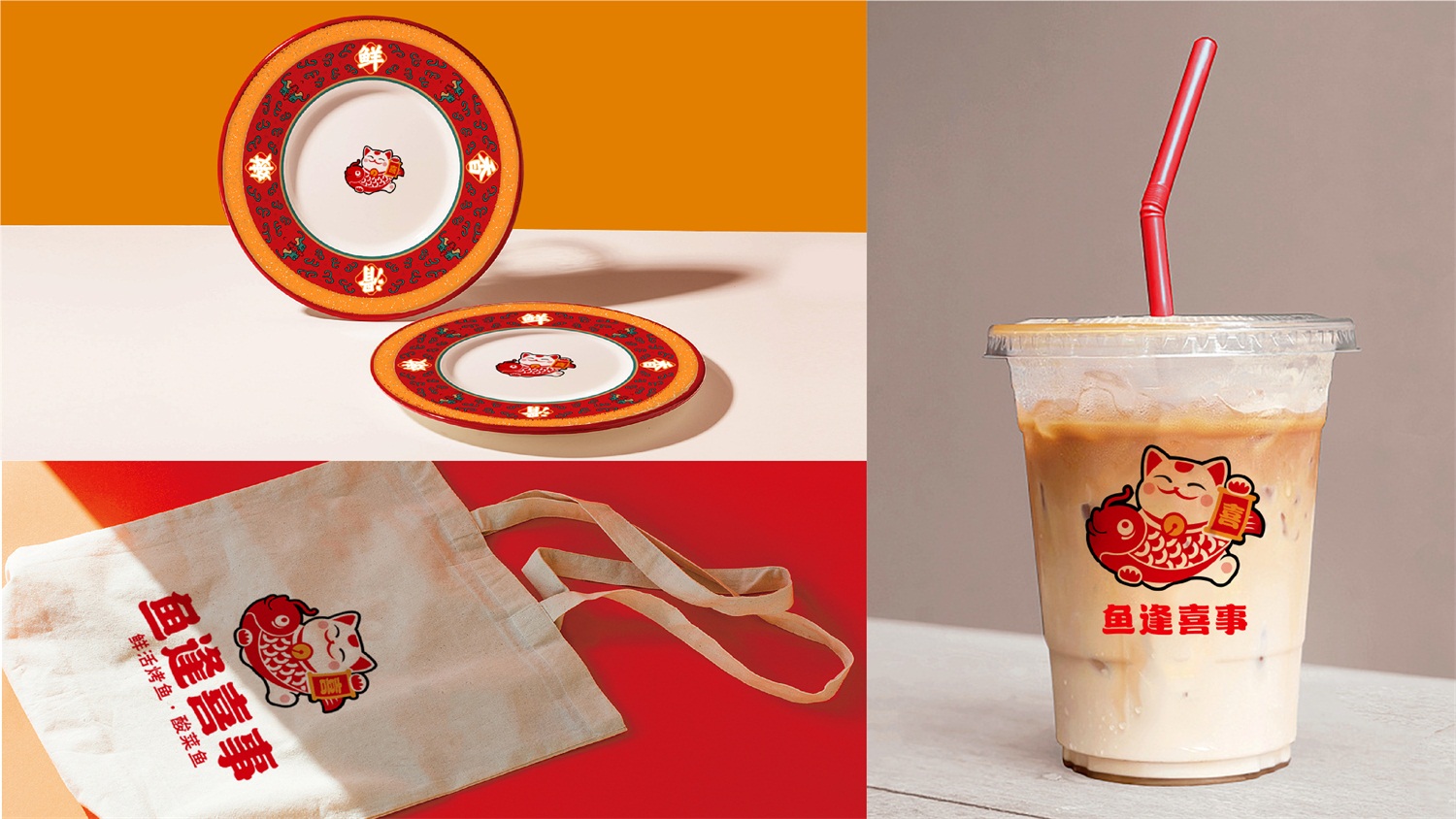 从策划营销角度构思品牌名称“鱼逢喜事”,明示品类;挖掘中国文化元素,创意设计“馋猫抱鱼”图形LOGO,以贪吃招财猫的可爱喜萌造型,传递品牌开心喜乐饮食理念;名称字体潇洒欢喜,动感十足,既有中国传统文化视觉特征,又有当下年轻的潮流范和国潮精神;品牌核心色彩依旧围绕品牌“开心喜乐”的血统,摆脱市场上毫无生气的冷淡平俗色彩,选用了复古时尚的国潮红,赋予品牌炙热温度,燃起观者精气神,加深品牌“喜”文化;餐厅空间注重打造就餐时的温馨舒适感,因此去除冗余的沉重装饰,颠覆鱼餐厅的晦暗沉闷,选用简约的木质桌椅和明亮的“喜”字灯饰,让就餐环境更加简洁精美,诠释生活点滴美好,即使在夜间,也依旧醒目有温度。