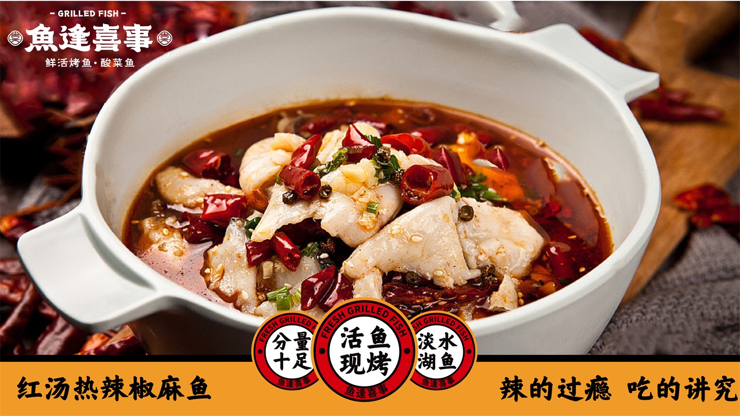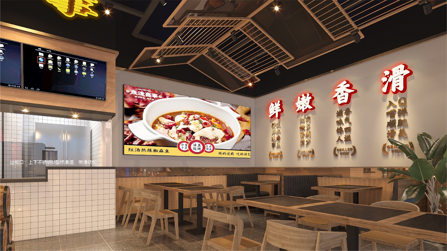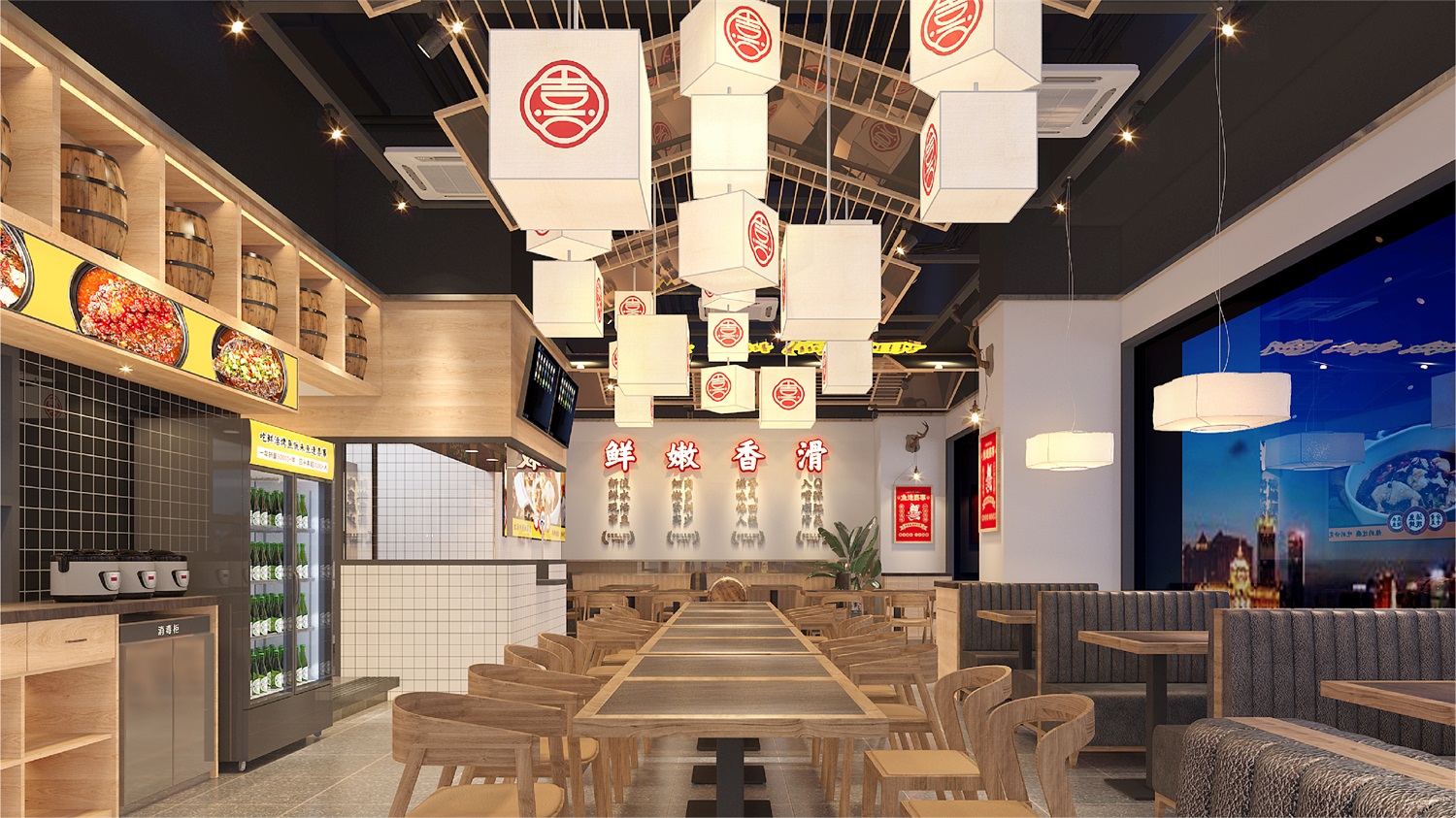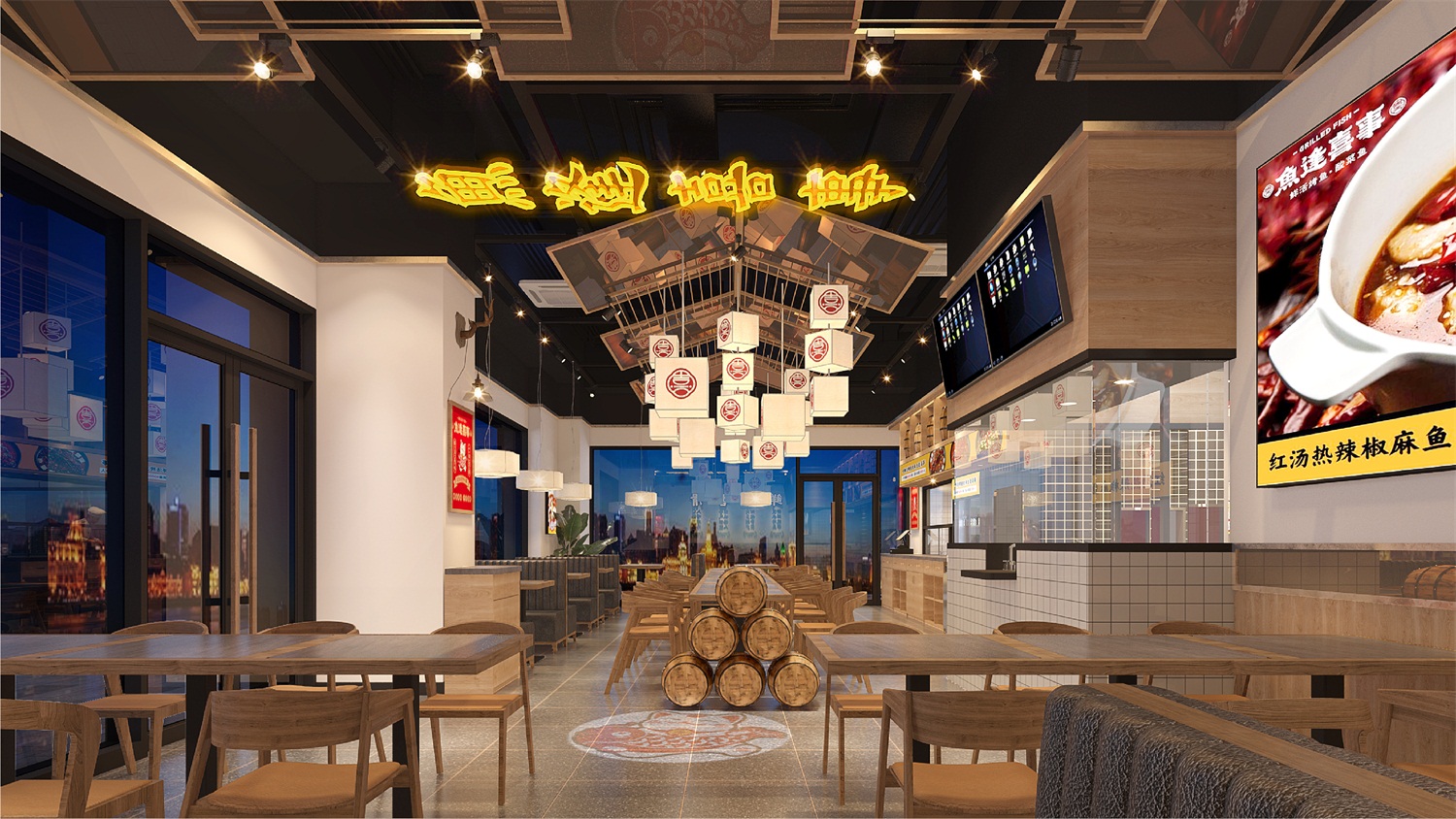 从策划营销角度构思品牌名称“鱼逢喜事”,明示品类;挖掘中国文化元素,创意设计“馋猫抱鱼”图形LOGO,以贪吃招财猫的可爱喜萌造型,传递品牌开心喜乐饮食理念;名称字体潇洒欢喜,动感十足,既有中国传统文化视觉特征,又有当下年轻的潮流范和国潮精神;品牌核心色彩依旧围绕品牌“开心喜乐”的血统,摆脱市场上毫无生气的冷淡平俗色彩,选用了复古时尚的国潮红,赋予品牌炙热温度,燃起观者精气神,加深品牌“喜”文化;餐厅空间注重打造就餐时的温馨舒适感,因此去除冗余的沉重装饰,颠覆鱼餐厅的晦暗沉闷,选用简约的木质桌椅和明亮的“喜”字灯饰,让就餐环境更加简洁精美,诠释生活点滴美好,即使在夜间,也依旧醒目有温度。