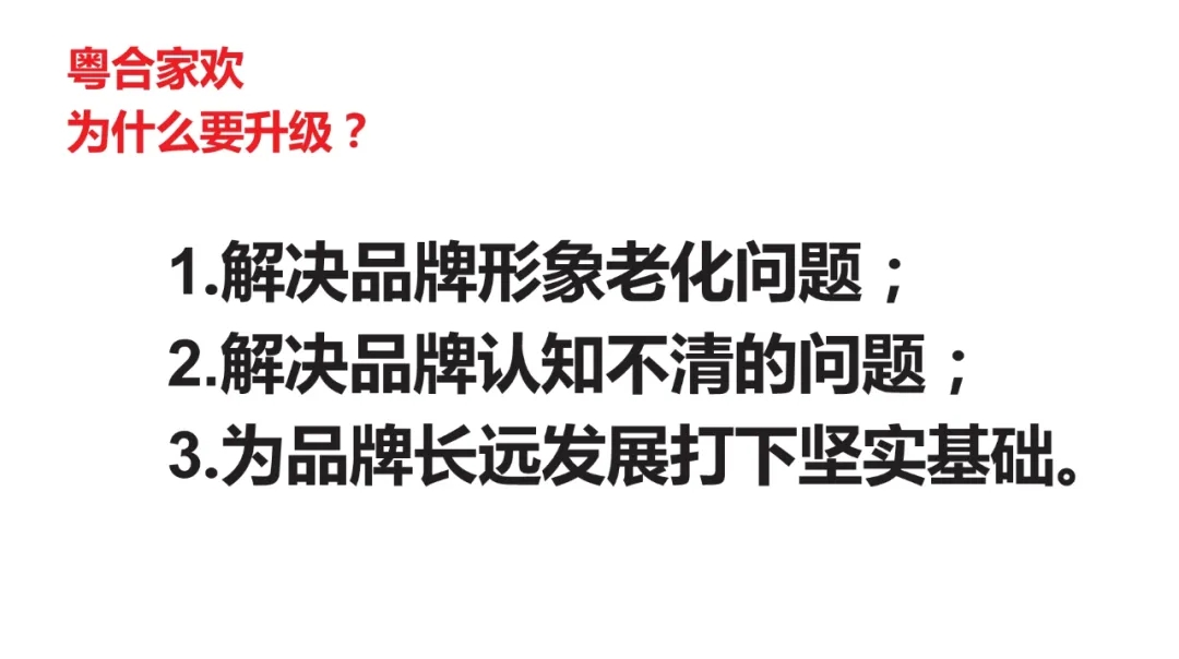 是本次升级的基本路径。经过前期的考察,我们发现,首先名称就存在问题。品牌名为“粤合家欢”,但在此之前,公司却为了增强辨识度、易记度,刻意地过度弱化“粤”字,只强调“合家欢”,这在商标的使用上并不合规;因此必须马上纠正过来,让“粤”字更光明正大地呈现在受众面前。