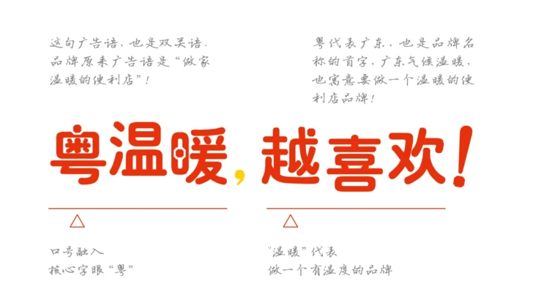 遵循明确的升级方向,我们构思出品牌slogan——“粤温暖,越喜欢!”将“粤”字融入其中,代替正常语法里的“越”字,显然是为了彰显品牌的地域标签。“合家欢”可以指家庭的和睦、快乐、幸福,而句中的“温暖”一词正与此产生情感上的对应,也和气候温暖的广东形成呼应,更体现了“做一个有温度的品牌”的理念。若给人带来这种宾至如归、友善美好的感受,那么便利店当然就会更让人喜欢,也更有盈利的底气和潜力。