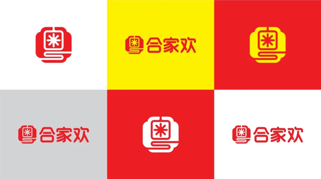 成为视觉系统工程的重中之重。在设计品牌LOGO时,我们对“粤”字进行抽象化改造,融入了灯笼、太阳、电灯、祥云/炊烟等创意元素,形成了一个更契合品牌理念精神的图标;这个字以后可广泛应用于品牌相关的任何物料和场景,高频率地重复进入公众视野,从而随着时间的积累,逐步成为品牌的视觉象征符号和第一品牌资产。另外,“合家欢”的字体也经过修改,去掉了尖锐方直的棱角感,采用更加柔和圆滑的笔触,以展现亲和力。
