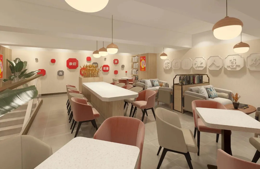 在门头效果足够夺目的前提下,粤合家欢的店内空间设计,应当围绕温暖、亲切的品牌调性来展开,并对顾客带来感官上的舒缓。试想一下,如果室内的形象同样是那么鲜艳、晃眼,那么便会给人造成一定的视觉负担,进而变成心理压力,最后影响顾客在店内逗留、消费的意愿,不利于卖货盈利。