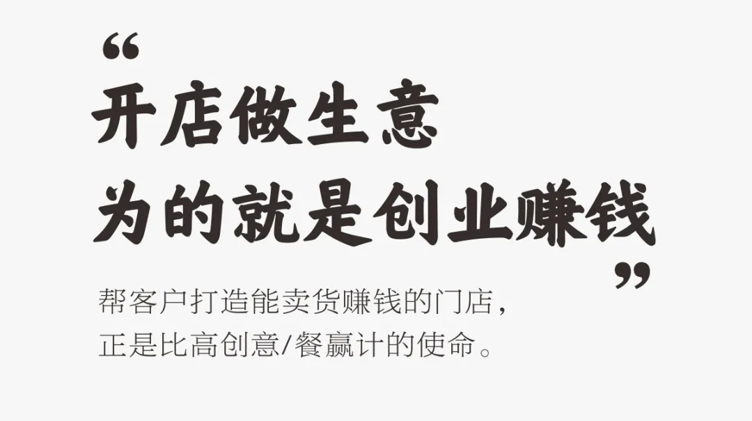 开店做生意,为的就是创业赚钱。帮客户打造能卖货赚钱的门店,正是比高创意/餐赢计的使命。我们以多维度框架工程打造标准化的品牌系统及文化,用品牌、营销、美学三位一体的思维创作设计和落地;为品牌植入优秀基因,为门店激发更多卖货潜力,为客户事业强劲赋能!